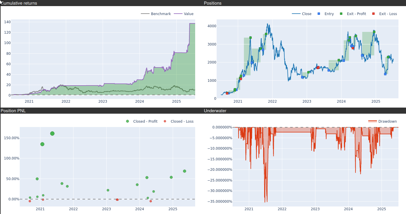With a maximum drawdown of only 35%, the strategy delivers an exceptional Calmar ratio above 4.